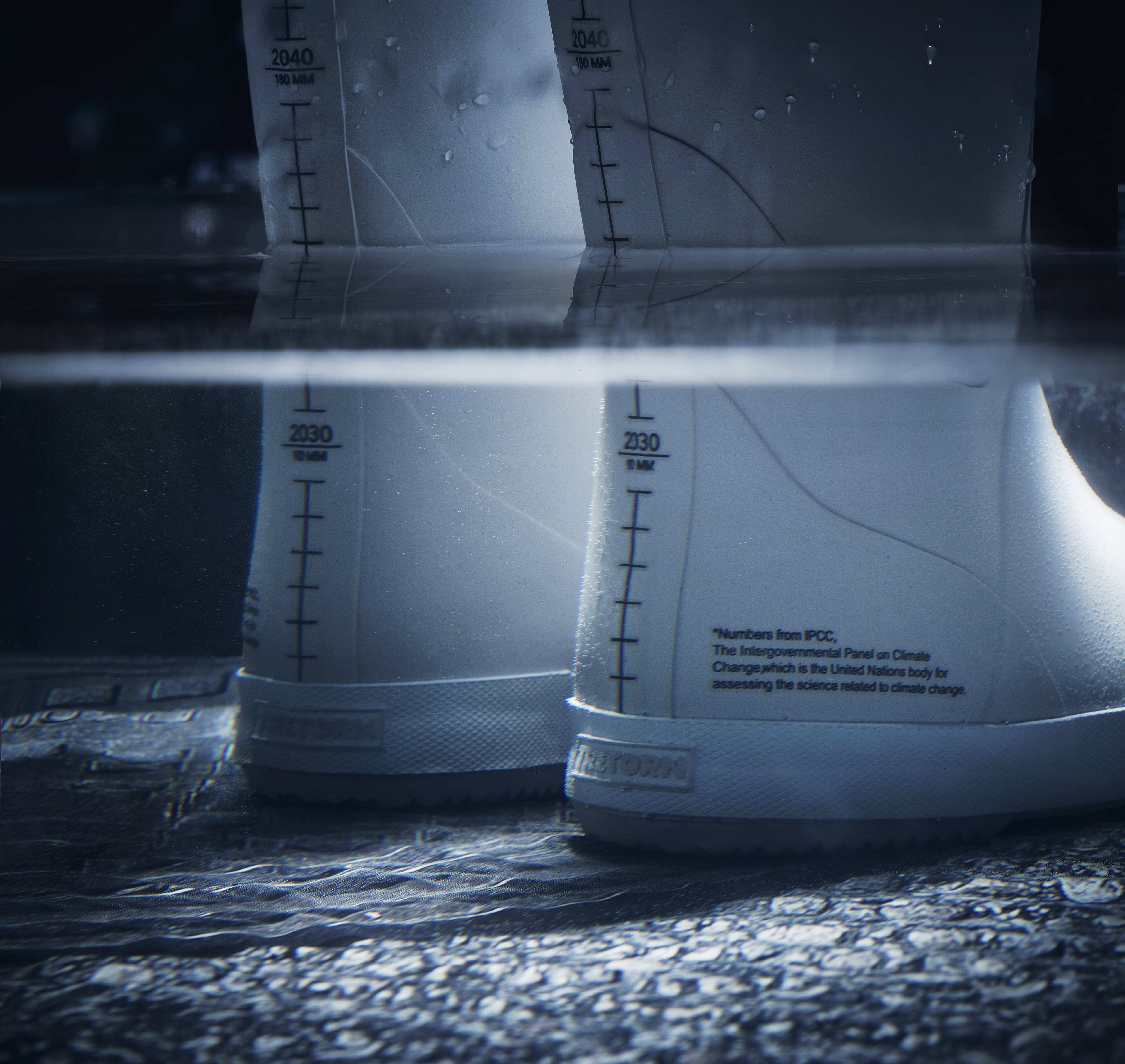 The SEA LEVEL RE-BOOT features a measuring stick which highlights one of climate changes biggest consequences, rising sea levels. The top measure, dated 2050, is a reminder that if changes are not made now, the boots won’t keep you dry by 2060.